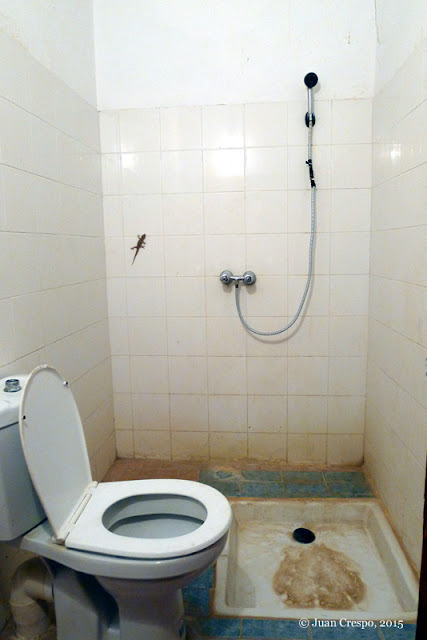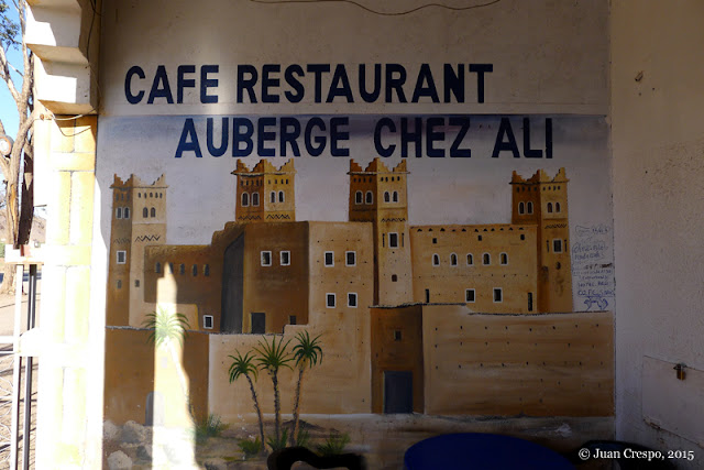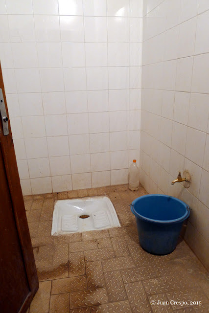 Una vez instalado en la habitación y todos los bártulos en orden pregunto por la ducha y me dicen que el agua está cortada, o sea que ni ducha, ni lavar la ropa. Me aseo con unas toallitas húmedas. Por supuesto le he dicho al del albergue que de los 70 dírhams se olvide por lo del corte de agua. Por lo que