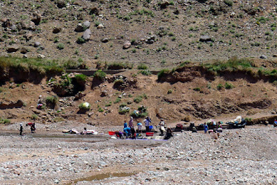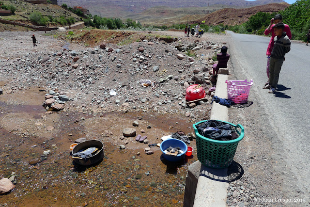 Durante la bajada hago algunas fotos del paisaje, impresionante. Unos kilómetros antes de llegar a Agouim veo a dos grupos de mujeres lavando en el río y, como es normal, paro para hacer unas fotos. Al